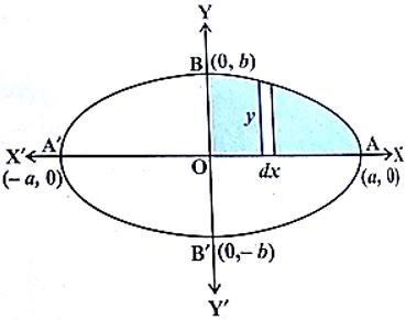 The correct answer is Option (3) → $\pi ab$ From given figure, the area of the region $ABA'B'A$ bounded by the ellipse $= 4 \left( \text{area of the region AOBA in the first quadrant bounded by the curve, } x\text{-axis and the ordinates } x = 0, x = a \right)$ (as the ellipse is symmetrical about both $x$-axis and $y$-axis) $= 4 \int\limits_{0}^{a} y \, dx \quad \text{(taking vertical strips)} \text{}$ Now $\frac{x^2}{a^2} + \frac{y^2}{b^2} = 1$ gives $y = \pm \frac{b}{a} \sqrt{a^2 - x^2}$, but as the region AOBA lies in the first quadrant, $y$ is taken as positive. So, the required area is $= 4 \int\limits_{0}^{a} \frac{b}{a} \sqrt{a^2 - x^2} \, dx \text{}$ $= \frac{4b}{a} \left[ \frac{x}{2}\sqrt{a^2 - x^2} + \frac{a^2}{2}\sin^{-1} \frac{x}{a} \right]_{0}^{a} $ $= \frac{4b}{a} \left[ \left( \frac{a}{2} \times 0 + \frac{a^2}{2}\sin^{-1} 1 \right) - 0 \right] \text{}$ $= \frac{4b}{a} \frac{a^2}{2} \frac{\pi}{2} = \pi ab \text{}$ |