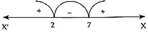 The correct answer is Option (2) → $(−∞,2)∪[7,∞)$ Given $\frac{x + 3}{x-2}≤ 2$. First we note that $x≠2$ $⇒\frac{x + 3}{x-2}-2≤0$ $⇒\frac{x + 3-2(x-2)}{x-2}-2≤0$ $⇒\frac{-x + 7}{x-2}≤0⇒\frac{x - 7}{x-2}≥0$ (Since $(x-2)^2>0,∀x∈R,x≠2)$ $⇒(x-7)(x-2)≥0$ ...(1) (Multiplying by $(x-2)^2$) Mark the numbers 2 and 7 on the number line. By the method of intervals, the inequality (1) is satisfied when $x ≤2$ or $x≥ 7$ but $x ≠ 2$ ∴ The solution set is $(−∞,2)∪[7,∞)$. |