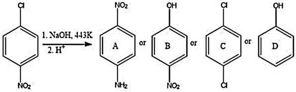 The given substrate is p-nitrochlorobenzene. On treatment with NaOH at 443 K followed by acidification (H⁺), it undergoes nucleophilic aromatic substitution (SNAr) because the –NO₂ group (strong –I, –R) at the para position activates the ring.