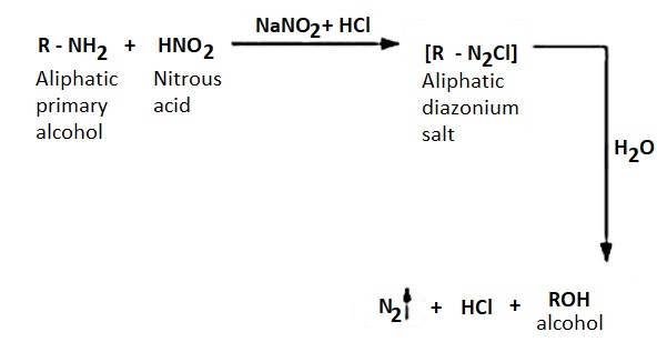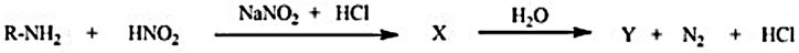 The correct answer is Option (3) → $ROH$ The given reaction involves a primary aliphatic amine (R–NH₂) reacting with nitrous acid (HNO₂). Nitrous acid is usually generated in situ by the reaction: NaNO₂ + HCl → HNO₂ + NaCl Step 1: Formation of diazonium intermediate The primary aliphatic amine reacts with nitrous acid to form an unstable aliphatic diazonium salt (R–N₂⁺Cl⁻). R–NH₂ + HNO₂ → R–N₂⁺Cl⁻ + H₂O Step 2: Decomposition Aliphatic diazonium salts are very unstable and immediately decompose in water, producing an alcohol, nitrogen gas, and HCl. R–N₂⁺Cl⁻ + H₂O → ROH + N₂ + HCl Thus, the final product Y is an alcohol (ROH). Option-wise Explanation Option 1: R–CONH₂ Incorrect. This represents an amide, which is not formed in this reaction. Option 2: R–COCl Incorrect. This represents an acid chloride, not produced from this reaction. Option 3: ROH Correct. Primary aliphatic amines react with nitrous acid to form alcohols with evolution of nitrogen gas. Option 4: R–NO₂ Incorrect. Nitro compounds are formed through nitration reactions, not through this reaction. |