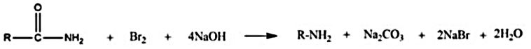 General reaction: R–CONHâ‚‚ + Brâ‚‚ + 4NaOH → R–NHâ‚‚ + Naâ‚‚CO₃ + 2NaBr + 2Hâ‚‚O This reaction is known as the Hoffmann bromamide degradation reaction (also called Hofmann rearrangement). Key features of this reaction: