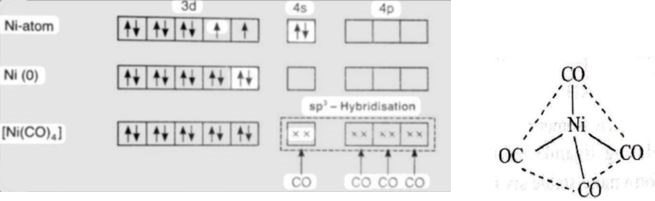 $Ni = [Ar] 3d^8 4s^2$ In $Ni^0$, electrons rearrange due to strong field $CO$ ligands: $3d^8 4s^2 \rightarrow 3d^{10}$ (paired), $4s$ and $4p$ empty Since four ligands are present, the geometry is tetrahedral, which requires $sp^3$ hybridisation (4 equivalent orbitals). No d-orbitals are used in hybridisation here, so $dsp^2$ or $spd^2$ are not possible. |