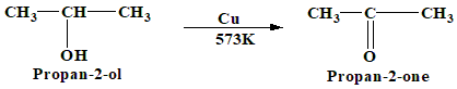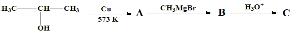 The correct answer is Option (2) To identify the product 'C' in the given reaction sequence involving propan-2-ol, let us break down each step in detail. Step 1: Reaction of propan-2-ol with Cu at high temperature The first reaction involves propan-2-ol reacting with copper (Cu) at high temperature (573 K). This process is known as dehydrogenation, which leads to the formation of propan-2-one. The balanced reaction is as follows: