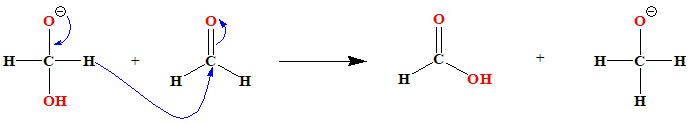 STEP 3: Here, one molecule is oxidized to carboxylic acid and the other one got reduced to an alcohol. It indicates that hydrogen is transferred from the second formaldehyde molecule. The reaction occurs very slowly when electron-donating groups are present but occurs at faster rates when electron withdrawing groups are present.