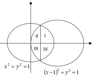 The correct answer is Option (2) → $\left(\frac{2\pi }{3}-\frac{\sqrt{3}}{2}\right) sq.units $ by symmetry area I = area II = area III = area IV finding intersection $x^2+y^2=1$ $(x-1)^2+y^2=1$ $⇒x^2=(x-1)^2$ $x-1=x$ so $x=\frac{1}{2}$ so area = $4×\int\limits_{\frac{1}{2}}^1\sqrt{1-x^2}dx$ $=4×\left[\frac{x}{2}\sqrt{1-x^2}+\frac{1}{2}\sin^{-1}x\right]_{\frac{1}{2}}^1$ $=π-\frac{\sqrt{3}}{2}-\frac{π}{3}=\frac{2π}{3}-\frac{\sqrt{3}}{2}$ |