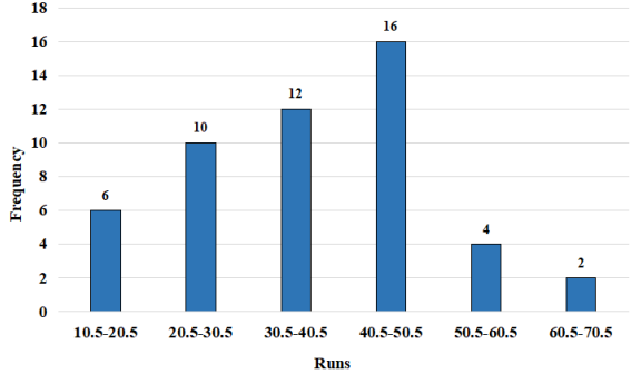 The histogram given below presents the frequency distribution of average runs scored by 50 selected players from a district in local cricket tournament. Study the histogram and answer the question that follows. How many players scored 30.5 runs or less? |