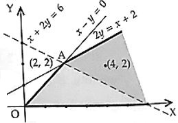 Here, we are to determine the maximum value. As the feasible region is unbounded, we cannot say whether the largest value 6 is maximum or not. To check whether largest value 6 is maximum: We draw the half plane $x+2y>6$ and notice it has common points with feasible region. Hence, there is no maximum value of Z. Notice that the point (4, 2) which lies in the feasible region yields $Z=8$ etc. In fact, all points in the dark shaded region yield values which are greater than 6. |