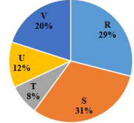 The pie chart given below show the runs scored by a batsman in five innings. Total runs scored by the batsman in all these five innings are 800. Runs scored by the batsman in a particular innings is shown as a percentage of runs scored in all these five innings. What is the difference between runs scored in S and U? |