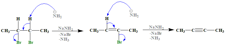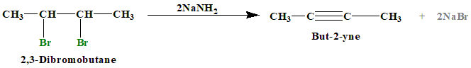 The correct answer is option 1. 2-Butyne. The given reactant in question is 2,3-Dibromobutane. When 2,3-dibromobutane is treated with excess sodium amide (\(\text{NaNH}_2\)), the reaction leads to the formation of 2-butyne through a double dehydrohalogenation process. An application of \(NaNH_2\) is in the formation of alkynes from halogens. Treatment of either geminal dihalides (i.e. – two halogens on one carbon) or vicinal dihalides (halogens on adjacent carbons) with \(NaNH_2\) (2 equiv) will result in the formation of alkynes.