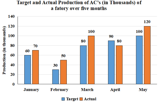 Total target production of ACs in February, March, April and May = ( 30 + 80 + 90 + 100 ) = 300 Total actual production of ACs over five months = ( 70 + 50 + 100 + 80 + 120 ) = 420 Required percentage = \(\frac{420-300 }{420}\) × 100 = \(\frac{120 }{420}\) × 100 = 28.6%