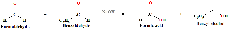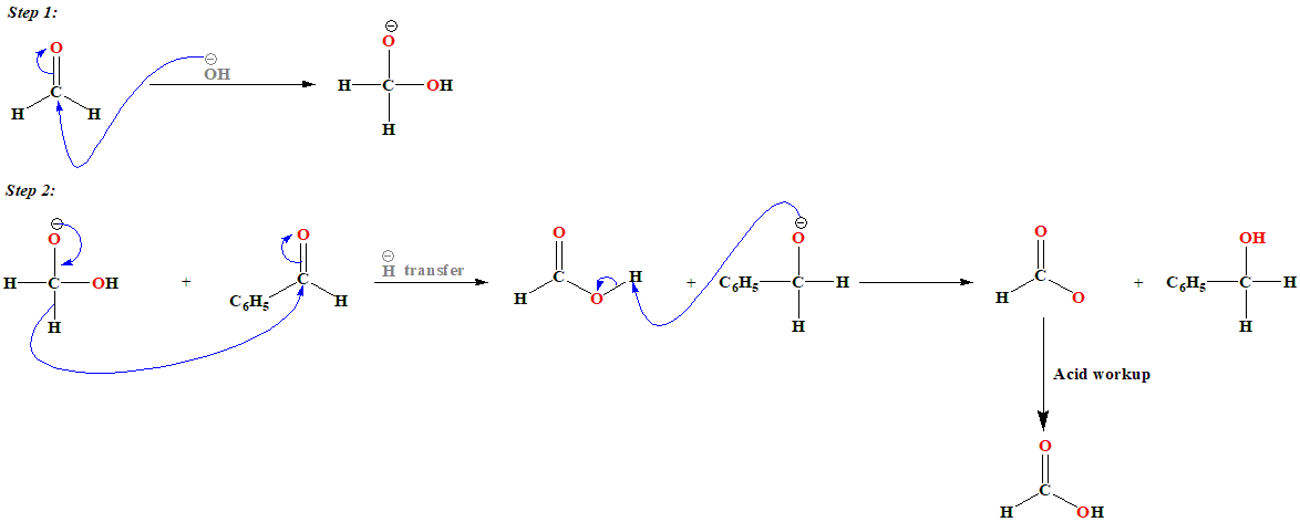 Mechanism: The reaction involves a nucleophilic acyl substitution on an aldehyde, with the leaving group concurrently attacking another aldehyde in the second step. First, hydroxide attacks a carbonyl. The resulting tetrahedral intermediate then collapses, re-forming the carbonyl and transferring hydride to attack another carbonyl. In the final step of the reaction, the acid and alkoxide ions formed exchange a proton. In the presence of a very high concentration of base, the aldehyde first forms a doubly charged anion from which a hydride ion is transferred to the second molecule of aldehyde to form carboxylate and alkoxide ions. Subsequently, the alkoxide ion acquires a proton from the solvent.