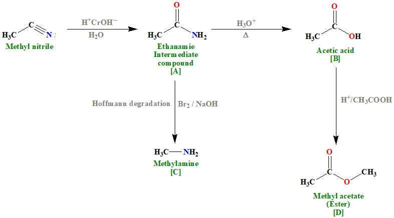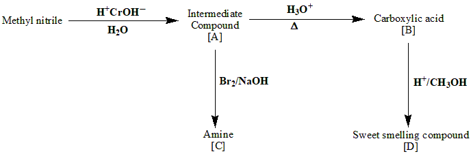 Methyl nitrile is hydrolyzed to carboxylic acid in the presence of \(H_3O^+\) as catalyst. An intermediate compound \([A]\) is formed during this reaction.