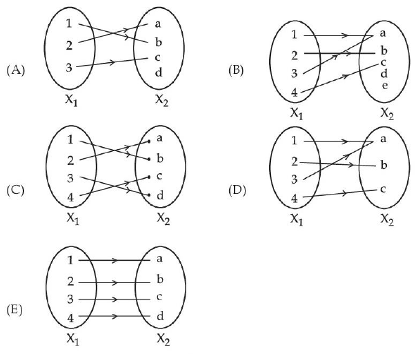 Which of the following figures shows a bijective function from set X1 to set X2: