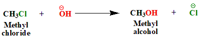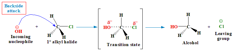 The rate of the reaction is expressed as: \(\text{Rate }= k [CH_3Cl][OH^—]\) In fact, methyl or primary alkyl halides follow this type of mechanism and it may, in general, be written as \(\text{Rate }= k [RX][OH^—]\) This reaction is also called nucleophilic substitution bimolecularbecause two molecules take part in determining the rate of the reaction. It is written as SN2, short form for substitution nucleophilic bimolecular. This type of reaction occurs in single (concerted) step through the formation of a transition state. In this mechanism, the nucleophile, \(OH^—\) attacks the partially positively charged carbon atom of carbon halogen bond from the direction 180° away from the halogen atom i.e., from the backside. This leads to a transition state with a partially formed \(C—OH\) bond and a partially broken \(C—Br\) bond. This process is a one-step reaction. In the transition state, the negative charge is shared by both the incoming nucleophile as well as outgoing chloride. Hydroxide has a diminished negative charge because it has begun to share its electrons with carbon while chlorine has developed a partial negative charge because it has partly removed a pair of electrons from carbon. Therefore, both \(OH\) and \(Br\) have a partial negative charge i.e., δ–. The remaining three bonds to carbon in the transition state adopt a planar arrangement.