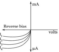 The correct answer is Option (2) → $I_4>I_3>I_2>I_1$ In reverse bias, the p-type of the junction is connected to the negative terminal and n-type to positive terminal. Due to this, the junction resistance is very high and practically no current flows through the circuit. |