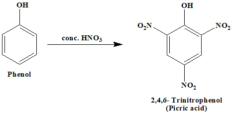 The correct answer is option 4. 2,4,6-Trinitrophenol; is produced. When phenol (\(\text{C}_6\text{H}_5\text{OH}\)) is treated with nitric acid (\(\text{HNO}_3\)), it undergoes nitration, resulting in the introduction of nitro groups onto the benzene ring. The specific products depend on the conditions and concentration of nitric acid used. Nitration of Phenol Reaction Conditions: Dilute Nitric Acid: When phenol is treated with dilute nitric acid, the primary product is 2-nitrophenol. This is because phenol is an activated aromatic compound, and the hydroxyl group (-OH) is an electron-donating group, which makes the ring more reactive towards electrophilic substitution. The nitro group preferentially adds to the ortho position relative to the hydroxyl group. Concentrated Nitric Acid: When phenol is treated with concentrated nitric acid, further nitration occurs due to the increased reactivity of the phenol ring. The primary products are 2,4-dinitrophenol and, under some conditions, 2,4,6-trinitrophenol. The additional nitro groups add to the remaining available positions on the benzene ring.