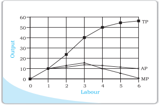 The correct answer is option 3: Law of variable Proportions In the graph, the TP increases as labour input increases. But the rate at which it increases is not constant. An increase in labour from 1 to 2 increases TP by 10 units. An increase in labour from 2 to 3 increases TP by 12. The rate at which TP increases is shown by the MP. Notice that the MP first increases (upto 3 units of labour) and then begins to fall. This tendency of the MP to first increase and then fall is called the law of variable proportions or the law of diminishing marginal product. Law of variable proportions say that the marginal product of a factor input initially rises with its employment level. But after reaching a certain level of employment, it starts falling. |