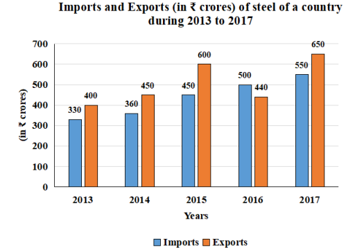 Study the bar graph which shows the imports and exports (in ₹) of steel of a country during 2013 to 2017 and answer the question that follows. For how many year(s) were the imports less than 80%ofthe average exports (per year) of the country during the five years? |