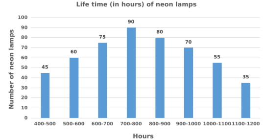 Number of neon lamps having life 500 hours or more but less than 700 hours = 60 + 75 = 135 Number of neon lamps having life 800 hours or more = 80 + 70 + 55 + 35 = 240 Required percentage = \(\frac{135 }{240}\) × 100 = 56.25% |