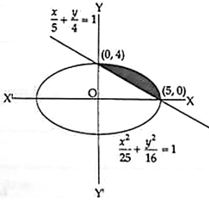 The correct answer is Option (2) → $5\pi - 10$ sq units Eq. of line: $\frac{x}{5} + \frac{y}{4} = 1$ $y = 4 \left( 1 - \frac{x}{5} \right) = 4 - \frac{4x}{5}$ Eq. of ellipse: $\frac{x^2}{25} + \frac{y^2}{16} = 1$ $y = 4 \sqrt{1 - \frac{x^2}{25}}$ $= \frac{4}{5} \sqrt{25 - x^2}$ $\text{Required area} = \int\limits_{0}^{5} (y_{\text{ellipse}} - y_{\text{line}}) \, dx$ $= \int\limits_{0}^{5} \left\{ \frac{4}{5} \sqrt{25 - x^2} - \left( 4 - \frac{4x}{5} \right) \right\} dx$ $= \int\limits_{0}^{5} \frac{4}{5} \sqrt{25 - x^2} \, dx - \int\limits_{0}^{5} \left( 4 - \frac{4x}{5} \right) dx$ $= \frac{4}{5} \left[ \frac{x}{2} \sqrt{25 - x^2} + \frac{1}{2} \cdot 25 \sin^{-1} \frac{x}{5} \right]_{0}^{5} - \left[ 4x - \frac{4x^2}{10} \right]_{0}^{5}$ $= \frac{4}{5} \left[ \frac{25}{2} \sin^{-1} 1 \right] - [20 - 10]$ Substituting $\sin^{-1}(1) = \frac{\pi}{2}$: $= \frac{4}{5} \times \frac{25\pi}{4} - 10$ $= (5\pi - 10)$ Required Area is $(5\pi - 10) \text{ units}^2$ |