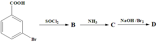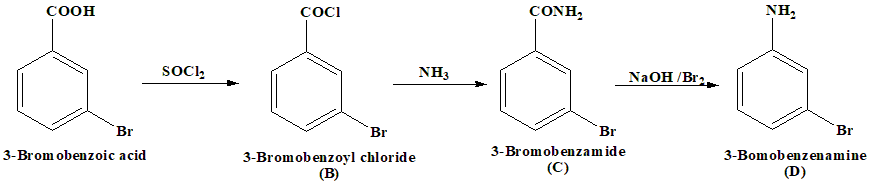 The correct answer is option 3. The reaction sequence outlines the transformation of 3-bromobenzoic acid into 3-bromobenzamine. Here is a detailed explanation of each step in the sequence: Conversion of 3-Bromobenzoic Acid to 3-Bromobenzoyl Chloride: