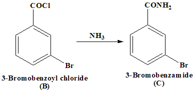 The acyl chloride (3-bromobenzoyl chloride) reacts with ammonia (\(\text{NH}_3\)) to form the corresponding amide (3-bromobenzamide). Ammonia acts as a nucleophile and attacks the carbonyl carbon, displacing the chloride ion. Conversion of 3-Bromobenzamide to 3-Bromobenzamine: