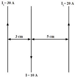Force due to first wire on middle wire is $F_1 = \frac{\mu_0 II_1}{6\pi}\times 25 = \frac{2500\mu_0}{2\pi}$ Force due to first wire on middle wire is $F_2 = \frac{\mu_0 II_2}{10\pi}\times 25 = \frac{1000\mu_0}{2\pi}$ Net Force F=F1−F2=$\frac{1500\mu_0}{2\pi}=3×10^{−4}N$ towards right |
