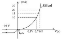 The correct answer is Option (4) → $1.0 × 10^7Ω$ The resistance of Diode at a particular voltage ($V_D$) is - $R=\frac{V_D}{I}$ [By ohm's law] $=\frac{10}{1μA}=10^7Ω$ |