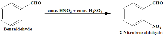 Nitration involves the introduction of a nitro group (\(-NO_2\)) into the benzene ring of benzaldehyde. The nitronium ion (\(NO_2^+\)) is generated from the nitrating mixture and attacks the benzene ring in an electrophilic aromatic substitution reaction. This reaction does not involve oxidation or reduction but rather an electrophilic aromatic substitution. B. Propan-1-ol to Propanal This is an oxidation reaction. Reagent: Pyridinium chlorochromate (PCC) or Chromium trioxide \((CrO_3)\) in acidic conditions.
