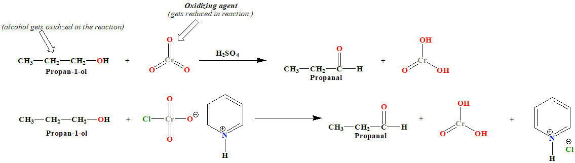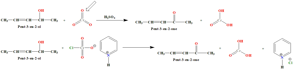 PCC and CrO₃ are used to oxidize primary alcohols to aldehydes. Propan-1-ol (a primary alcohol) is oxidized to Propanal (an aldehyde). This reaction involves the removal of two hydrogen atoms: one from the hydroxyl group and one from the carbon adjacent to the hydroxyl group. C. Pent-3-en-2-ol to Pent-3-en-2-one This is an oxidation reaction. Reagent: Pyridinium chlorochromate (PCC) or Chromium trioxide (CrO₃).