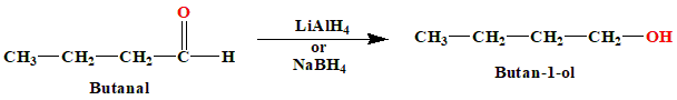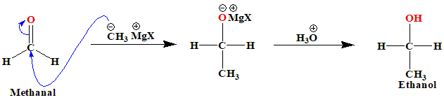 LiAlH₄ and NaBH₄ are reducing agents that reduce aldehydes to primary alcohols. Butanal (an aldehyde) is reduced to Butan-1-ol (a primary alcohol). This involves the addition of hydride ions (\(H^-\)) to the carbonyl group, converting the aldehyde to an alcohol. E. Methanal to Ethanol This is a Grignard reaction. Reagent: Grignard reagent (e.g., Methylmagnesium bromide) followed by acidic workup.