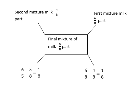 The correct answer is option (1) :10 litre from 1st can, 10 litre from 2nd can Quantity of milk in 1st mixture $=\frac{75}{100}=\frac{3}{4}$ part. Quantity of milk in 2nd mixture $=\frac{50}{100}=\frac{1}{2}$ part. So Quantity of milk in final mixture $=\frac{5}{8}$ part. LCM of $4, 2, 8=8$ $∴\frac{\text{Quantity of 2nd mix}}{\text{Quantity of 1s mix}}=\frac{\frac{1}{8}}{\frac{1}{8}}=1:1$ Hence, equal quantity of mixture from each can i.e 10 lit from 1st can so 10 lit from 2nd can should be mixed. |