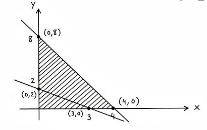 now checking inequality with points (0, 0) for $2 x+3 y ≥ 6$ 0 ≥ 6 → not correct → (solution lies in half not containing (0, 0)) for inequality 2x + y ≤ 8 with (0, 0) ⇒ 0 ≤ 8 → (solution lies in part containing (0, 0) origin) Corner points are A (0, 8) B (0, 2) C (4, 0) D (3, 0) Checking function for each point $z(x, y)=x+3 y$ $z(0,8)=0+3 \times 8=24$ $z(0, z)=0+3 \times 2=6$ $z(4,0)=4+0=4$ $z(3,0)=3+0=3$ So at (3, 0) Minimum value of function is 3 |