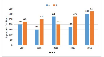 Study the given bar graph and answer the question that follows. The bar graph shows the exports of cars of types A and B (in ₹ million). What is the ratio of the total exports of cars of type A in 2016 and 2018 to the total exports of cars of type B in 2015 and 2017? |
