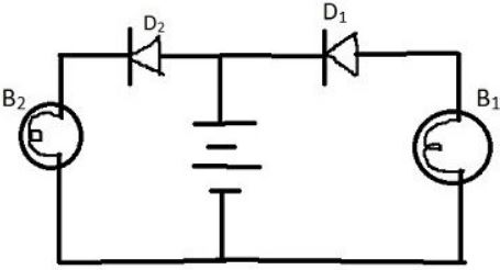 In the circuit diagram, the battery, diodes $D_1$ and $D_2$, bulbs $B_1$ and $B_2$ are connected as shown. Which of the following statements is true regarding bulbs $B_1$ and $B_2$? |