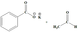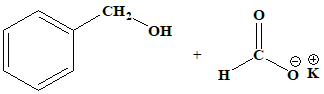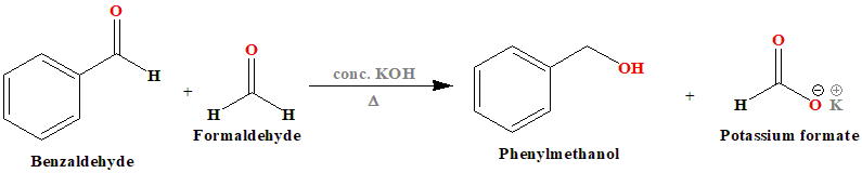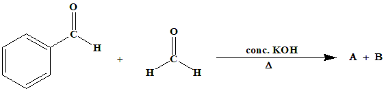 The correct answer is option 2. The reaction given here is Cannizzaro reaction: Aldehydes like benzaldehyde, formaldehyde, trimethyl acetaldehyde etc. have no \(\alpha \)-hydrogen atoms, undergo disproportionation in the presence of strong base ot form equal amounts of corresponding alcohols and carboxylic acids. This reaction involves the reduction of one molecule of the aldehyde at the expense of the other that gets oxidized.