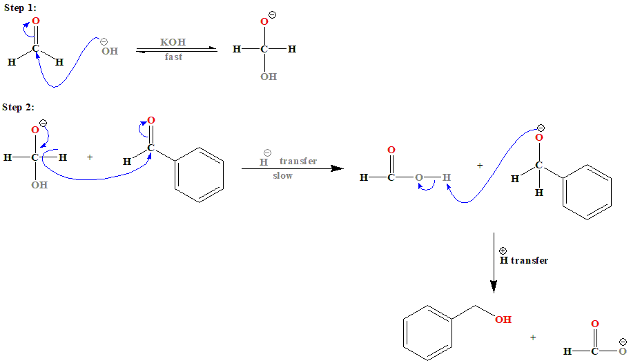 Mechanism: It involves nucleophilic addition of \(:\overset{-}{OH}\) to first molecule of aldehyde, followed by hydride transfer to other molecule and then \(H^+\) transfer, as shown below:
