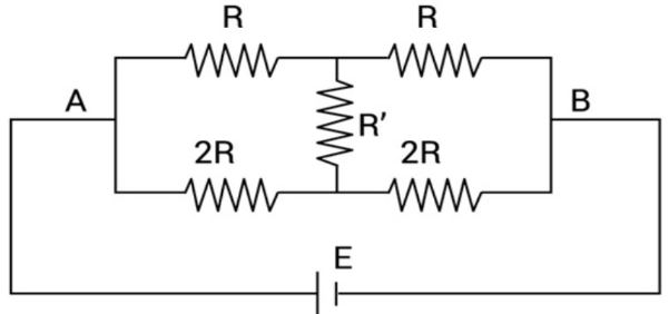 This is a balanced wheatstone bridge so no current will flow through the branch containing resistance R'. Equivalent resistance is $R_{eq} = \frac{2R.4R}{2R + 4R} = \frac{4R}{3}$ $R_{eq}$ is independent of R'. |