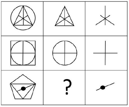 So the middle figure in Row 3 should be the internal lines inside the pentagon with the dot, but without the outer pentagon. |