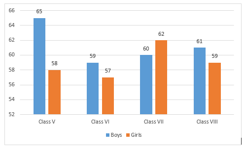 The following graph shows the number of boys and girls in Class V, Class VI, Class VII and Class VIII. Study the graph and answer the question. What is the average number of girls in all the classes ? |