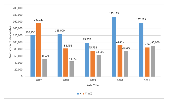 A Chocolate company prepares three different kids of chocolate - X, Y and Z. The production of X, Y and Z over a period of five years has been expressed in the bar graph. the total production of Z in 2017 and 2018 is what percentage of the total production of X in 2020 and 2021? |