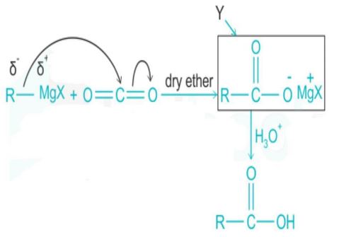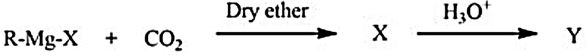 The correct answer is Option (1) → RCOOH Grignard reagents (R–Mg–X) are highly reactive organometallic compounds that act as strong nucleophiles. When a Grignard reagent reacts with carbon dioxide (CO₂) in dry ether, the nucleophilic carbon of the Grignard reagent attacks the electrophilic carbon of CO₂ to form a magnesium carboxylate intermediate. Reaction step: R–MgX + CO₂ → RCOO⁻MgX This intermediate is represented as X. When the reaction mixture is treated with acidic hydrolysis (H₃O⁺), the magnesium salt is protonated to produce a carboxylic acid. RCOO⁻MgX + H₃O⁺ → RCOOH Thus, the final product Y is a carboxylic acid (RCOOH). This reaction is commonly used in organic synthesis to increase the carbon chain length by one carbon atom. Option-wise Explanation Option 1: RCOOH Correct. Grignard reagent reacts with CO₂ followed by acidic hydrolysis to give a carboxylic acid. Option 2: RCHO Incorrect. Aldehydes are typically formed when Grignard reagents react with formyl derivatives, not CO₂. Option 3: RCOX Incorrect. Acyl halides are not produced in this reaction sequence. Option 4: ROH Incorrect. Alcohols are formed when Grignard reagents react with carbonyl compounds such as aldehydes or ketones, not with CO₂. |