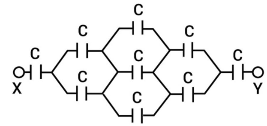 Equivalent Capacitance $\frac{1}{C_{eq}} =\frac{1}{C}+\frac{1}{2C}+\frac{1}{3C}+\frac{1}{2C}+\frac{1}{C}= \frac{10}{3C}$