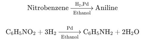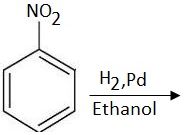 The correct answer is Option (2) → Aniline The reaction shown is a classic example of catalytic hydrogenation of an aromatic nitro compound. The nitrobenzene ($\text{C}_6\text{H}_5\text{NO}_2$) reacts with hydrogen gas ($\text{H}_2$) in the presence of a palladium ($\text{Pd}$) catalyst and an ethanol solvent. The Reaction This specific set of reagents ($\text{H}_2/\text{Pd}$ or often $\text{H}_2/\text{Pd/C}$) is a powerful and common method used to reduce the nitro functional group ($\text{–NO}_2$) to a primary amino functional group ($\text{–NH}_2$). The chemical transformation is: The Product The reduction of nitrobenzene gives Aniline (also known as Phenylamine).