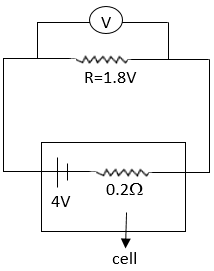 The correct answer is Option (3) → 3.6 V Now, Current (I) = $\frac{V}{R}$ [By ohm's law] $=\frac{4}{1.8+0.2}$ $=2A$ ∴ Voltage across resistance = $2×1.8=3.6V$ |