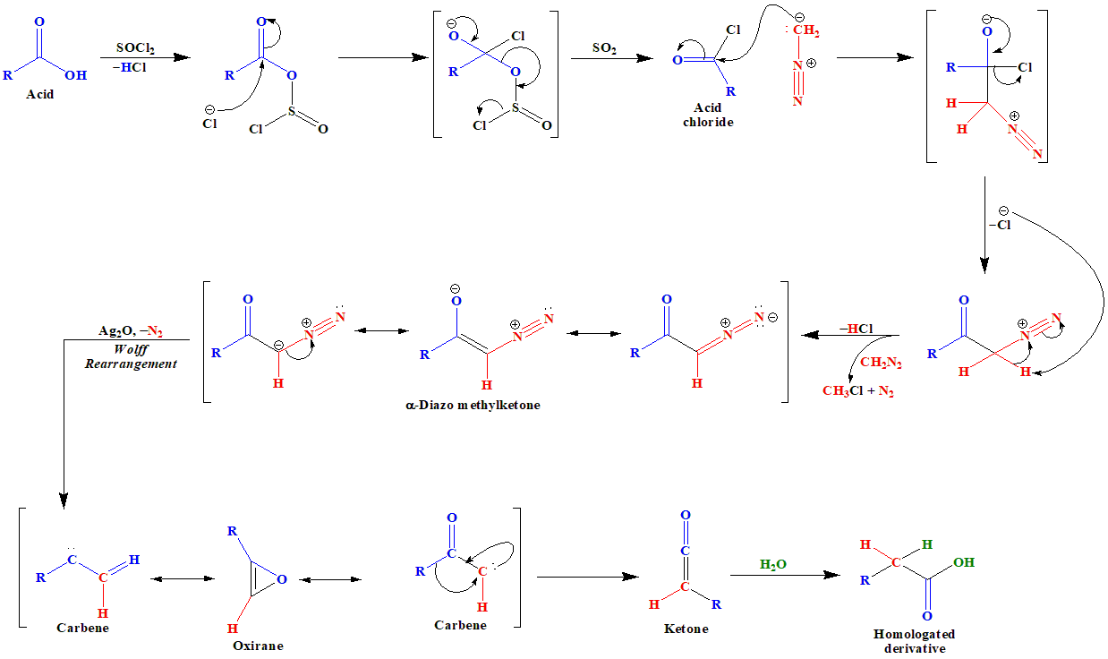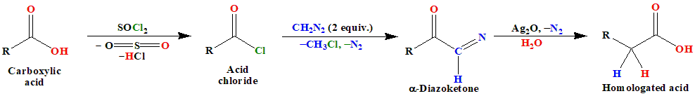 Mechanism: The Arndt-Eistert reaction proceeds through the following stepwise mechanism: 1. Formation of diazomethane: The reaction begins with the generation of diazomethane \((CH_2N_2)\) from nitrosomethylurethane or another precursor. 2. Conversion of carboxylic acid to methyl ester: The diazomethane is then used to convert the carboxylic acid to its methyl ester by an insertion reaction. The carbenoid intermediate formed in this step is highly reactive and can potentially react with other functional groups in the reaction mixture, which makes the reaction somewhat unpredictable. 3. Halogenation: The next step involves halogenation of the methyl ester, typically with chlorine or bromine, to form an acyl halide. This is usually accomplished using a halogenating agent such as phosphorus pentachloride \((PCl_5)\) or thionyl chloride \((SOCl_2)\). 4. Substitution with an amine: Finally, an amine is added to the reaction mixture, which undergoes nucleophilic substitution with the acyl halide to form the N-acyl derivative of the original carboxylic acid.