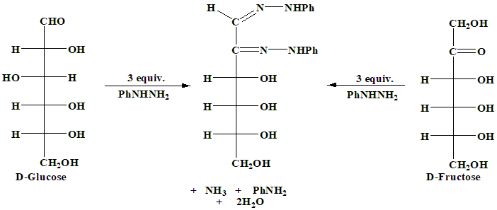 The correct answer s option 1. Glucose, Fructose. D-glucose and D-fructose form the same osazone treated with excess phenyl hydrazine because they differ only 1st and 2nd carbon atoms which are transformed to the same form.