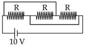 Three equal resistance, each of R ohm, are connected as shown. A cell of 10 volts and internal resistance 0.5 is connected across the circuit. Calculate the value of R for which heat generated in the circuit is maximum. |