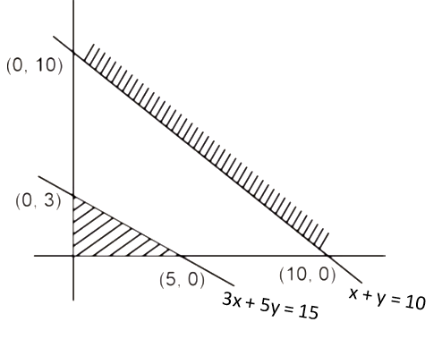 x + y ≥10 3x + 5y ≤ 15 x, y ≥ 0 Region is not feasible Option: B |
