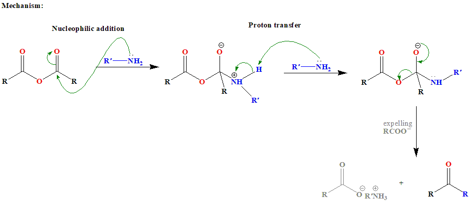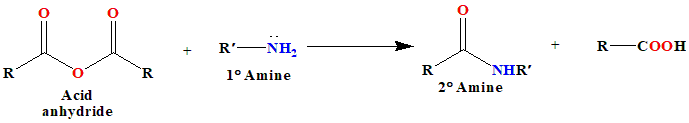 The correct answer is option 1. amide. Acid anhydrides react with primary amines to give amides. This reaction typically proceeds through nucleophilic acyl substitution, where the primary amine replaces one of the acyl groups \((R-CO-)\) of the acid anhydride.